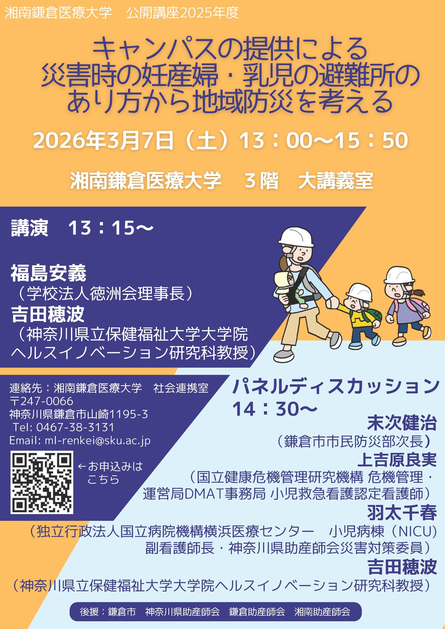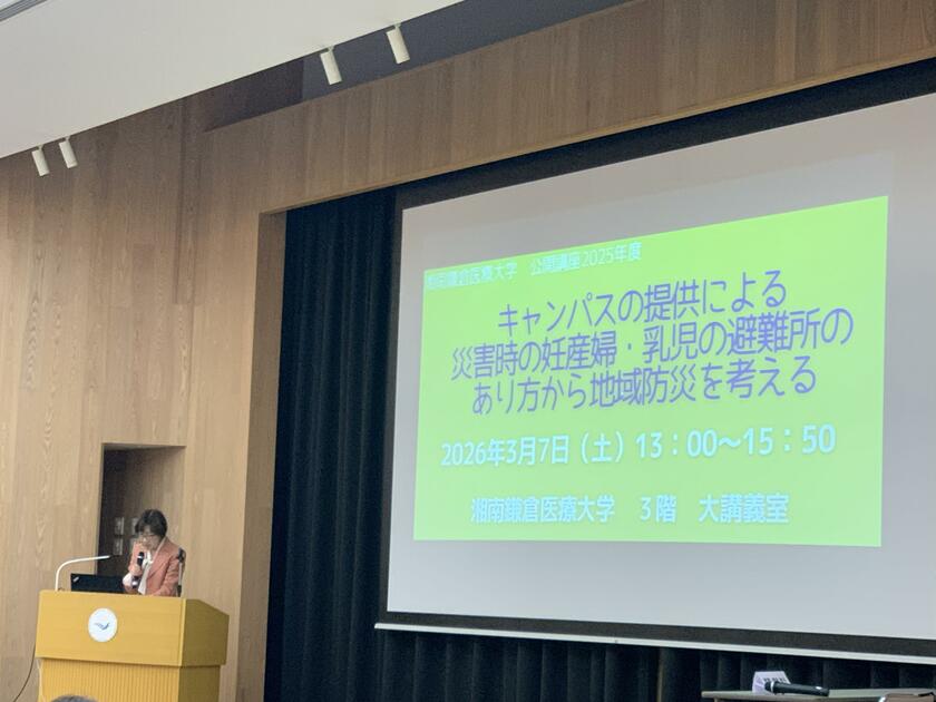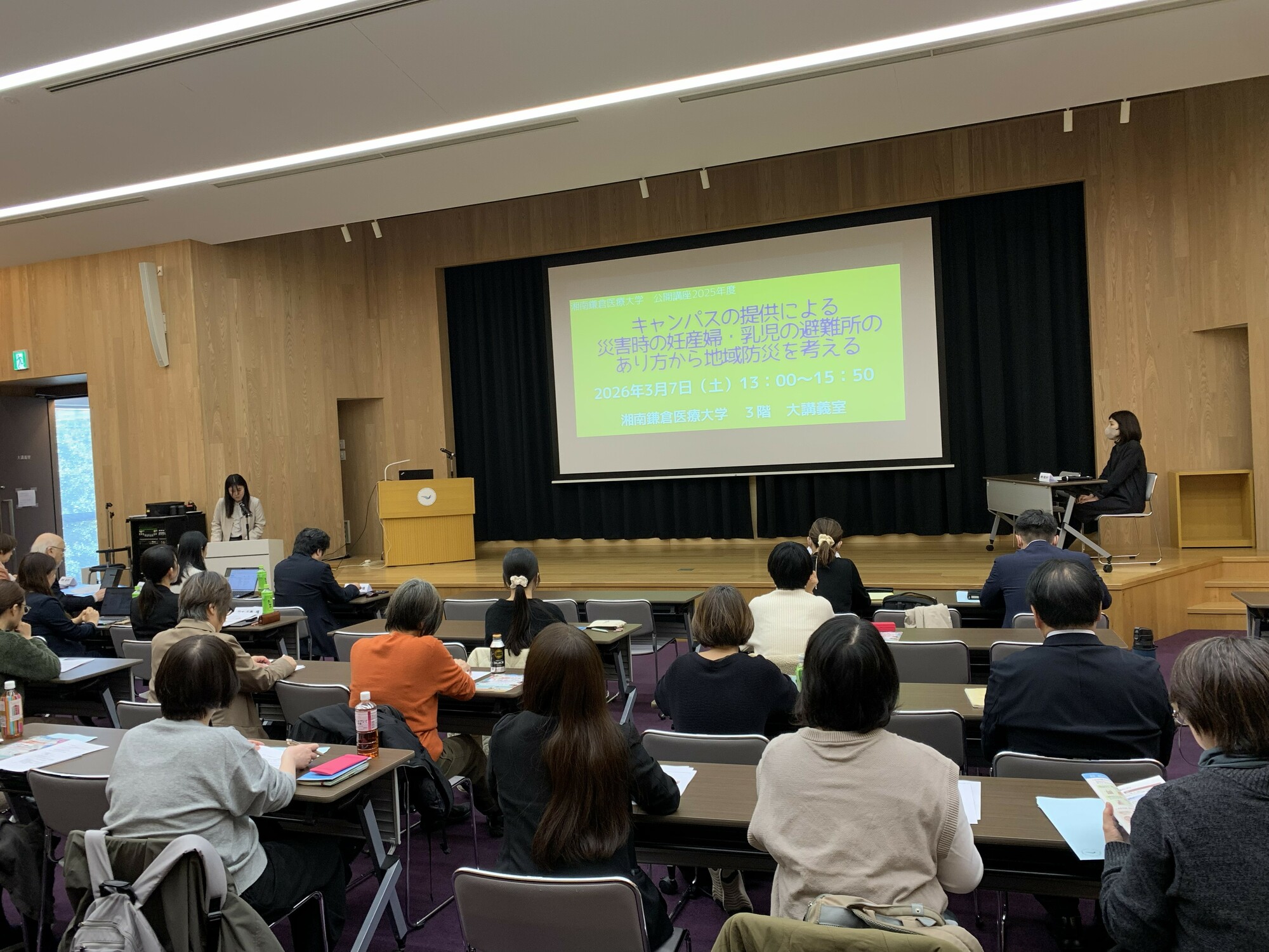 2026年3月7日(土)13:00~ 本学(湘南鎌倉医療大学)3階の大講義室にて、公開講座「キャンパスの提供による災害時の妊産婦・乳児の避難所のあり方から地域防災を考える」を開催しました。