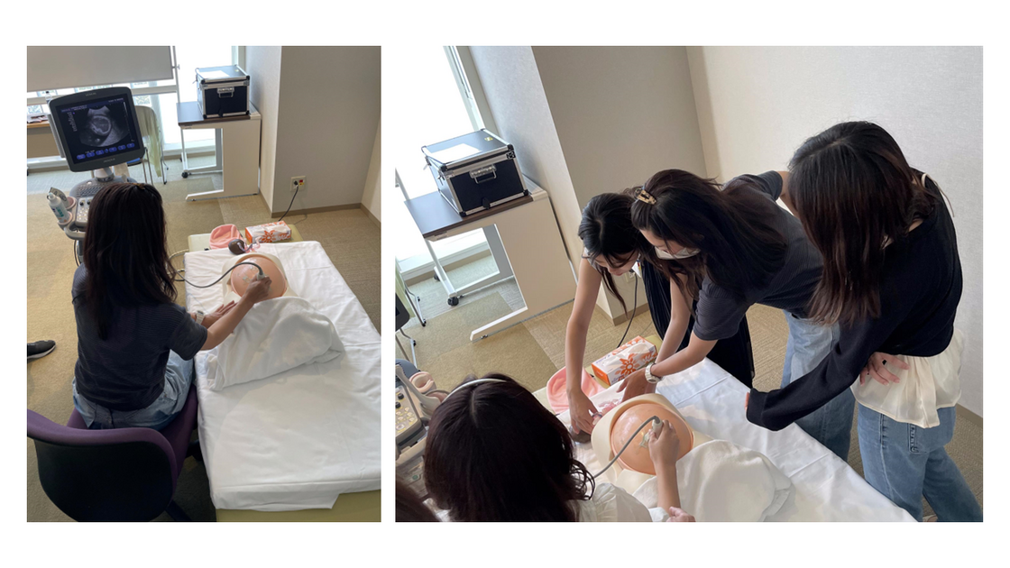 助産診断・技術学演習Iでは、産科医師から妊婦健診中の超音波検査について学び、実技演習しました。